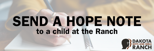 Hope is a very powerful thing. For kids at Dakota Boys and Girls Ranch, hope can mean the difference between successful treatment and giving up on life. You can provide hope for our kids. Your message will let a boy or girl know that someone cares and wants them to succeed. It's easy to do and takes just a few minutes! Send a message of hope to a child at the Ranch by clicking on the link above.